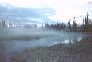 About four hours after I took this picture, I had to cross this moat in order to get back to camp. I was only wearing my knee boots that day, too. The icy water was waist deep and smelled like rotting vegetation. I had to hold my binoculars, GPS unit and data sheets over my head in order to keep them from getting ruined. As if hiking in rubber boots wasn't bad enough, the wettness of my boots and socks caused my feet to get soft and rub raw during the three kilometer hike back to camp.